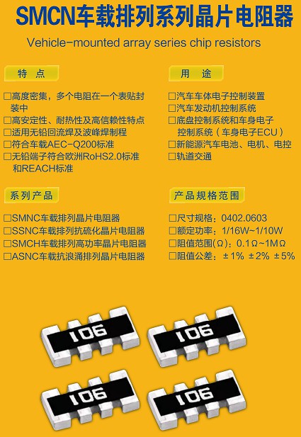 SMCN车载排列系列晶片电阻器特点: 1、高度密集,多个电阻在一个表贴封装中 2、高安定性、耐热性及高信赖性特点 3、适用无铅回流焊及波峰焊制程 4、...